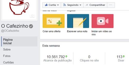 A Fanpage do Cafezinho está chegando a 400 mil curtidas. Nos últimos 7 dias, tivemos mais de 15 mil novas curtidas. Nesse ritmo, chegaremos a meio milhão de curtidas em algumas semanas. O alcance semanal atingiu quase 10 milhões de pessoas. O envolvimento foi superior a 2 milhões de pessoas.