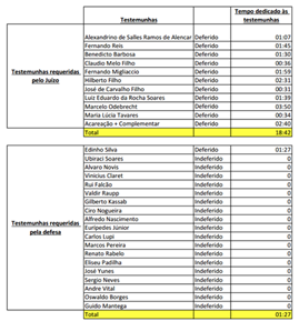 A defesa sustenta que houve um desequilíbrio na condução do processo, sendo a defesa prejudicada pela desigualdade de condições, inclusive porque a acusação pode dispor de mais tempo para sustentar suas absurdas alegações de que a chapa Dilma-Temer foi abastecida com dinheiro ilegal. As testemunhas requeridas pelo juízo – do empresário Marcelo Odebrecht aos ex-diretores da empreiteira – falaram durante 18h42. As testemunhas arroladas pela defesa para contrapor as acusações somaram 1h27.