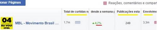 Observe-se que o total de curtidas, nos 07 dias que antecederam o protesto de dezembro, somou 1.7 milhões (primeiro número, à esquerda) e que o envolvimento com as publicações (último número à direita) chegou a 3.3 milhões. Com isso, como se vê no número sublinhado em vermelho, o MBL chegou a 4.7% de crescimento em seu número de curtidas. Ou seja, foi um crescimento expressivo.
