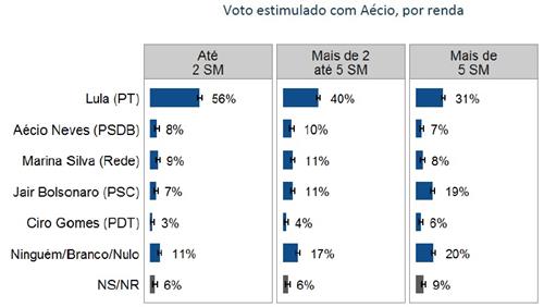 Jair Bolsonaro tem quase três vezes mais votos do que Aécio, entre o eleitor com renda superior a 5 salários. E mesmo Lula vence com folga nesta faixa de renda. Entre os pobres, Lula mantém a majestade. A crise está fazendo, possivelmente, o eleitor de classe média baixa voltar a pensar como classe trabalhadora, e a votar em Lula.