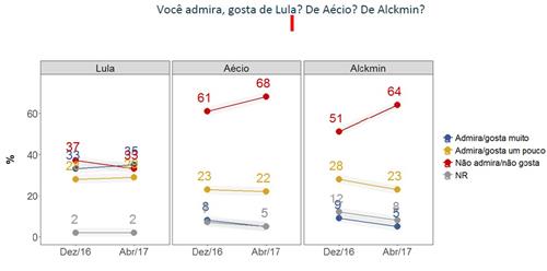 O histórico de Aécio é curioso. Repare que, em abril de 2016, ele tinha 17% contra 29% de Lula: uma diferença de 12% em favor de Lula. Agora, após um ano de golpe, Lula tem 44% e Aécio, 9%: diferença de 35% em favor de Lula! O golpe fez muito mal a Aécio e aos tucanos em geral. Marina, contudo, também perdeu. O eleitor não parece muito satisfeito com o silêncio cúmplice da candidata.