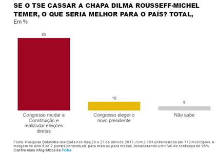 A Datafel-lha mente, manipula, provoque… Mas, apesar que gente sabe histórico de manipuladores de opinião, uma coisa tem importância – 85% é para DIRETAS JÁ! Com esse governo desastroso, daqui a pouco o apoio para as diretas vai ser 100%! Então, tem que montar de uns três dias multidão na porta do STF e exigir referendo! Invés de Lula 2018., nos podemos ter o Lula de 2017!!!