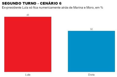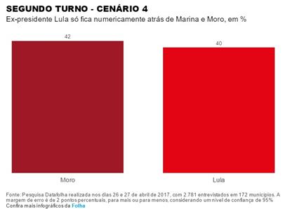 4) Datafolha testa Sergio Moro para primeiro e segundo turnos. No 1º turno, Moro tem apenas 9% e ainda não incomoda. No segundo turno, Lula (40%) e Moro (42%) empatam. A exposição de Moro como candidato presidencial, no entanto, tira sua aura de juiz. Agora ele é candidato, e será visto assim pela população, que poderá, a partir deste momento, discutir essa possibilidade e ouvir críticas a seu respeito. A mídia também será pressionada a publicar críticas, pela mesma razão. É muito improvável, todavia, que Moro participe do pleito, porque isso implicaria em tirar toda a credibilidade, já em queda, de seu trabalho na Lava Jato.