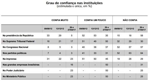 No mesmo Datafolha que apurou que 85% dos brasileiros querem Diretas Já e apenas 10% querem eleições indiretas, há uma tabela interessante sobre o prestígio das instituições. Analisem com atenção. Volto em seguida.