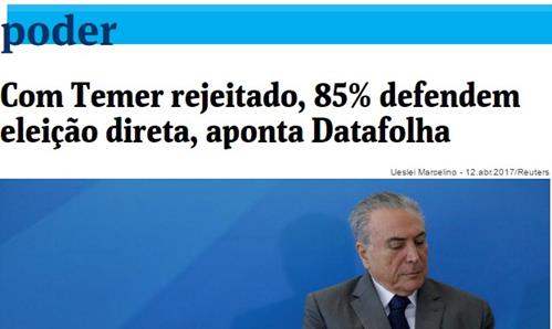 Já já esse discurso de diretas já por grande parte dos leitores da folha , veja vai mudar…quando perceberem que tem risco de alguem odiado por eles se eleger… Vão negar a democracia 3 vezes e aceitar um tosco eleito pelo congresso…