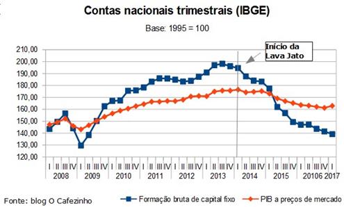 O gráfico abaixo, que preparamos com base nos últimos números do IBGE para o PIB trimestral, mostra claramente que o declínio da Formação Bruta de Capital Fixo (ou seja, dos investimentos no Brasil, privados e públicos) teve início exatamente com a Operação Lava Jato, a saber, a partir do primeiro trimestre de 2014. Até então, os investimentos vinham apresentando uma taxa de crescimento constante, coincidindo inclusive com a forte aprovação ao governo Dilma.