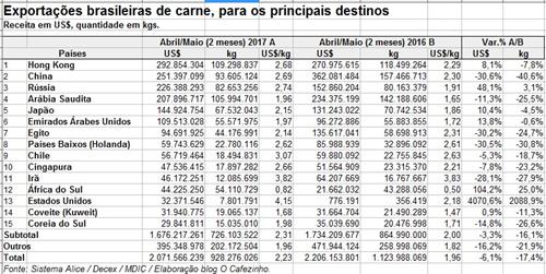 As exportações brasileiras de carne, nos últimos dois meses (abril e maio), caíram 17% em volume sobre o mesmo período do ano anterior. Essa queda pode ter representado a perda de aproximadamente 500 milhões de dólares, quase 2 bilhões de reais, em apenas dois meses.
