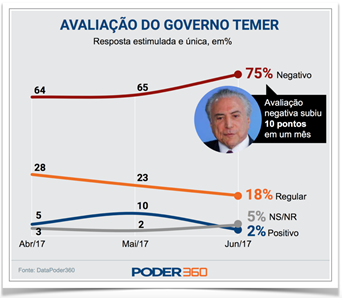 A avaliação negativa do governo cresceu ainda mais: 75% acham o governo ruim. O percentual de brasileiros que aprova Temer caiu para… 2%.
