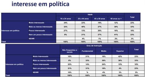O interesse por política está ligado diretamente ao grau de instrução, o que é razão pela qual a mídia consegue manipular tanto as informações; está ligado também à juventude.