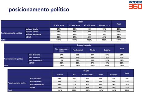 Quanto ao posicionamento político, a direita está na frente, e com muita força na juventude. A esquerda tem ligeira vantagem sobre a direita, no entanto, entre quem possui ensino superior: 25% X 23%.