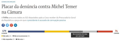 O “placar” da Folha, que diz ter conversado com todos os deputados, é fortemente favorável a Temer. A oposição só tem 179 votos, no momento, dos 342 necessários para autorizar uma investigação contra o presidente, obrigando-o a se afastar.