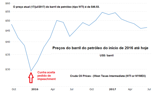 Observe, no entanto, o gráfico. Ele mostra que o nível mais baixo dos preços internacionais do petróleo coincidiram religiosamente com a aceitação, por Eduardo Cunha, então presidente da Câmara, do pedido de impeachment de Dilma Rousseff.