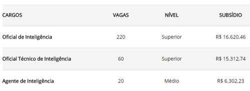 As vagas são destinadas a três cargos: 220 para oficial de Inteligência, 60 para oficial técnico de Inteligência e 20 para agente de Inteligência. Os dois primeiros são de nível superior, enquanto o último é de nível médio (detalhes dos cargos e das carreiras da ABIN).