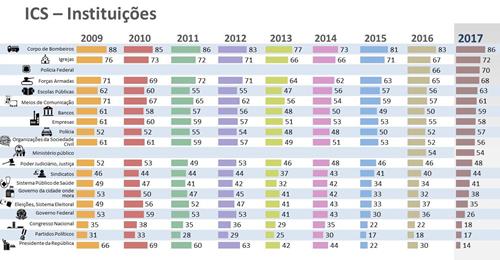 Na terceira posição, aparece a Polícia Federal, presente no ICS desde o ano passado. Nesse período, houve evolução: de 67 em 2016 para os atuais 72. Na sequência, estão Forças Armadas (68 pontos), Escolas Públicas (63) e Meios de Comunicação (61).