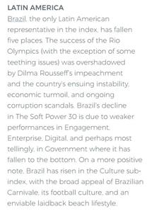 Na entrevista de Celso Amorim à BBC, o repórter cita a queda do Brasil nos rankings globais de “soft power”. Então eu fui procurar e vi que, de fato, o país despencou no ranking Soft30, feito pelo USC Center of Public Diplomacy.