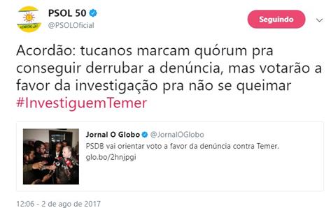 A primeira etapa já foi superada. O quórum necessário para encerrar discussão já foi atingido. O quórum para votação agora é de 342 deputados, a partir do qual a denúncia contra Temer será votada. Se 342 deputados votarem contra Temer, ele será cassado.