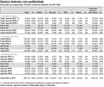 Os quatro grandes canais de TV aberta, Globo, Record, SBT e Band receberam, nos sete primeiros meses de 2017, um valor correspondente a 67% de toda a verba federal de publicidade. A parte do leão ficou com a Globo, com 46%. A Record veio em segundo, com 11%.