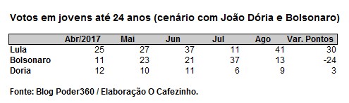 Um número interessante do relatório do DataPoder360, divulgado hoje, é a força de Lula na juventude. A pesquisa mostra uma certa inconsistência em julho. Parece que os pesquisadores trocaram os números de Bolsonaro e Lula. Mas eles voltam à normalidade em agosto. Lula vem crescendo de maneira firme entre os jovens até 24 anos, atingindo 41% do eleitorado em agosto.