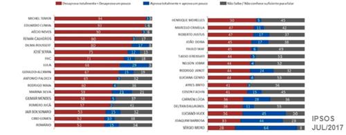 A reprovação ainda é alta, de 66%, porém menor que a de todos os caciques tucanos mais conhecidos, como Aécio (que tem 91% de reprovação e apenas 3% de aprovação), Serra e Alckmin (ver gráfico abaixo).