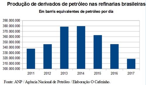 Prezado redator; A queda da produção de derivados no País tem a ver com dois fatores: 1) redução do consumo por conta da recessão fruto de uma política econômica desastrosa do governo Dilma; 2) aumento da margem (diferença de preço entre derivados e petróleo) praticada no País por orientação da política de preços da PETROBRAS que, se por um lado resulta em maior receita, por outro possibilita maior importação direta de derivados pelas cias distribuidoras.