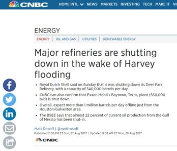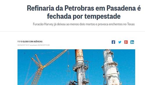 Segundo notícia publicada na Fortune, a produção norte-americana de derivados de petróleo teria caído em mais de 10% por causa do Harvey, e a Globo fala que “Pasadena é fechada por tempestade”…