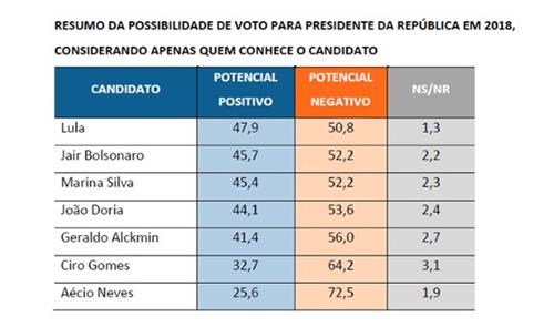 Bolsonaro, Doria, Alckmin, Marina, todos têm rejeição superior a Lula.