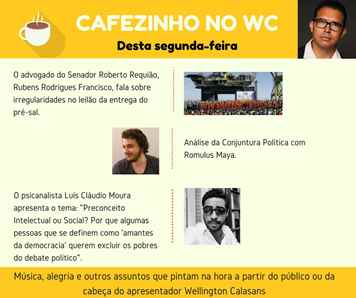 Imperdível! Hoje no Programa Cafezinho no WC os seguintes assuntos em destaque: