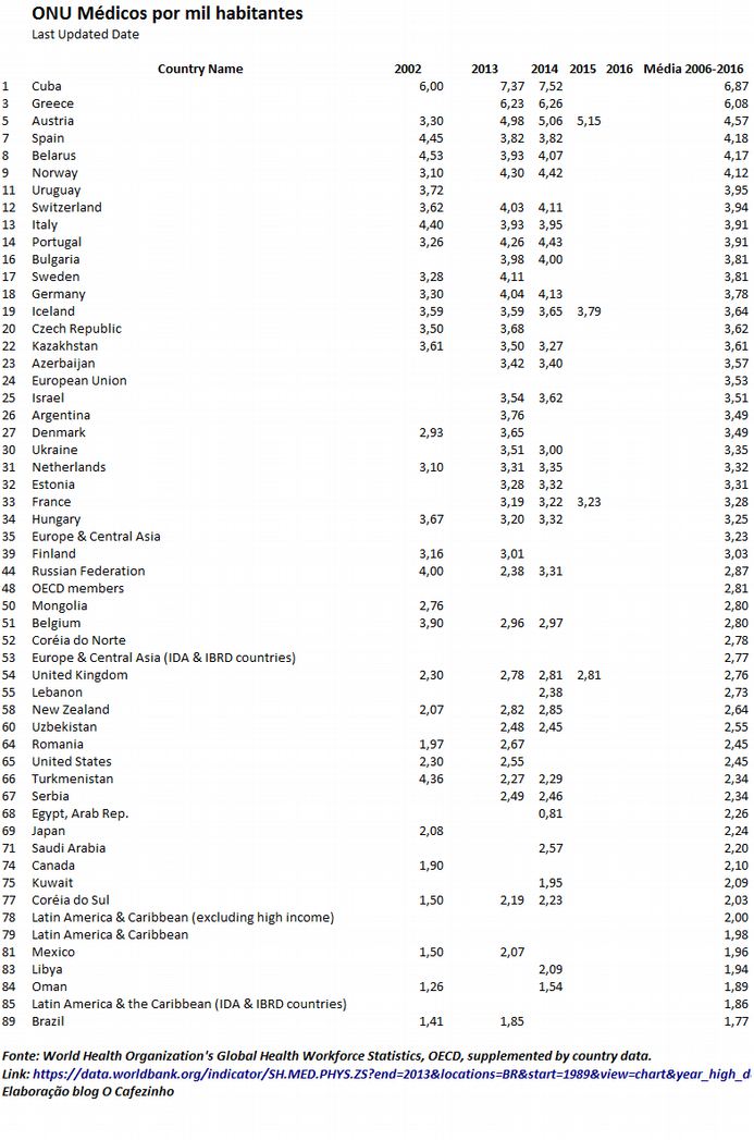 Alguns leitores ficaram incomodados, razoavelmente, pelo fato d’eu ter usado uma tabela pouco atualizada, num post anterior sobre número de médicos por mil habitantes.