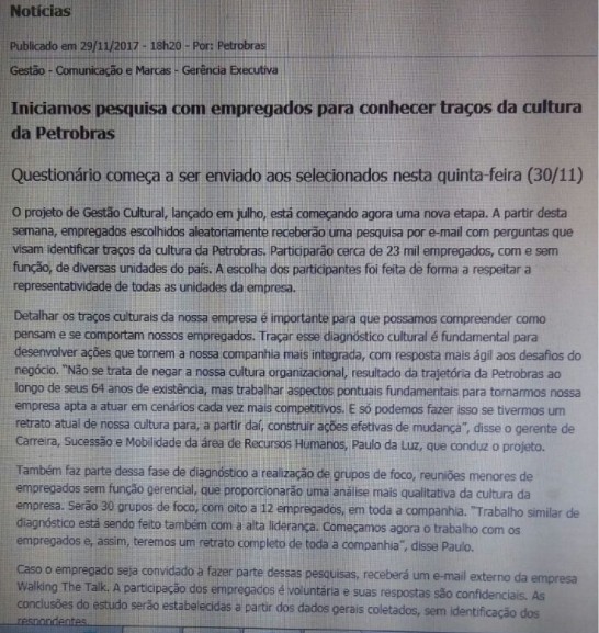 Os funcionários da Petrobrás começaram a receber, nos últimos dias, avisos de que deverão participar de um programa de pesquisa para conhecer “traços da cultura” da empresa.