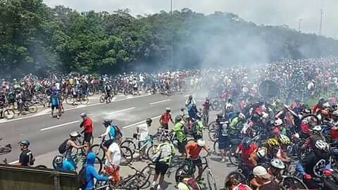 Uma placa dizendo que o evento foi impedido mesmo respeitando o Código de Trânsito Brasileiro, que garante a bicicleta como um veículo, ou seja, tem os mesmos direitos de transitar nas avenidas e rodovias.E logo após a mensagem na tela, a tradicional descida para Santos foi reprimida com bombas de gás lacrimogêneo e bala de borracha na rodovia Anchieta.