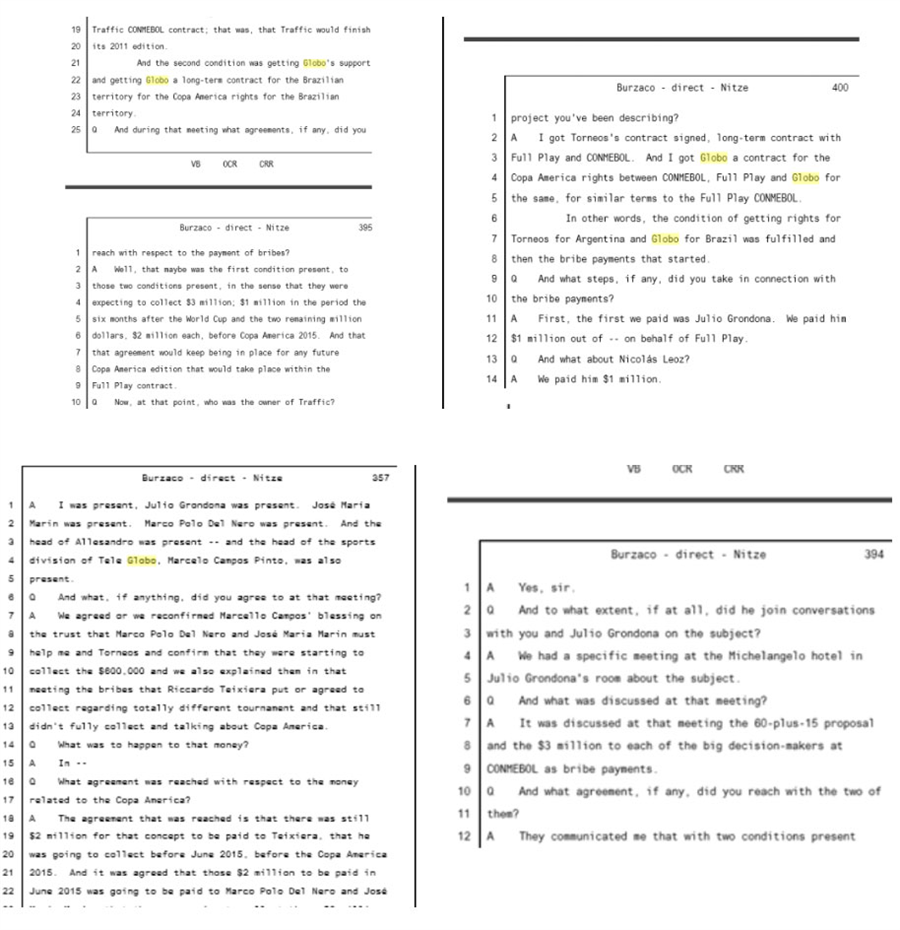 Está tudo lá bem explicadinho nos documentos do Tribunal do Brooklyn (Nova Iorque): “Os direitos foram transmitidos à TeleGlobo no Brasil. Para isso a T&T Netherland recolheria da TeleGlobo e usaria parte dos fundos para pagar subornos”. Essa é só uma das acusações de Alejandro Burzaco. Ele afirma ainda que os preços dos direitos de transmissão foram colocados abaixo do valor real de mercado, para que houvesse espaço para propina. O depoimento dele somado ao de Marin, junto com os documentos enviados pela Promotoria da Suíça são arrasadores para a Globo. Está bem detalhado como Ricardo Texeira, José Maria Marin e Marco Polo Del Nero receberam milhões pela transmissão de jogos da seleção brasileira, da Copa do Mundo, da Copa América e outros eventos. Só na Copa América de 2015, Teixeira, Marin e Del Nero receberam R$ 10 milhões.
