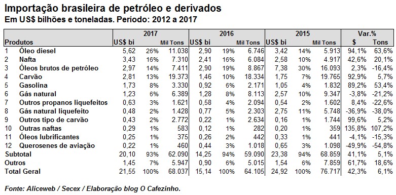 Ocorre que, em 2017, como já dissemos acima, o Brasil importou US$ 5,6 bilhões em óleo diesel, aumento de 94% sobre o ano anterior!