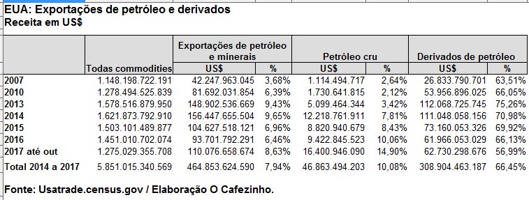 No acumulado de quase quatro anos de 2014 até outubro de 2017, segundo fontes oficiais do governo americano, os Estados Unidos exportaram um total de 309 bilhões de dólares em derivados de petróleo, o que daria quase 1 trilhão de reais.