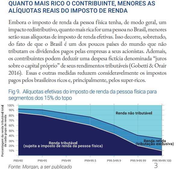 Outro gráfico impressionante revela que, no Brasil, quando mais rico você é, menos impostos você paga. A razão principal disso é uma lei, aprovada no primeiro ano do governo FHC, que eliminou impostos sobre lucros e dividendos, a principal fonte de renda dos setores mais ricos.