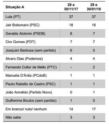Esses números mostram que o eleitorado brasileiro, claro que atingido pelos resultados que a Força Tarefa da Lava Jato, das punições que distribuem a torto e à direita aos políticos da oposição, principalmente o Presidente Lula, da campanha na mídia denegrindo o nome de Lula, ainda devotam um forte apoio ao grande líder. Pena que precisa muito otimismo (ou seria ingenuidade?) para acreditar que a ditadura imperante (ou seria semi-ditadura, ou, de fato fato, a famosa ditabranda, que a FSP de forma cínica identificou na ditadura 1964/1985) vá permitir, com o Judiciário golpista tudo comandando para beneficiar o grande capital, inclusive à frente das eleições, com o Governo golpista do usurpador, Temer, com maioria nas duas casas do Congresso, que Lula seja candidato. Ditadura só faz eleição presidencial para ganhar e trocar de gurda. Continuando do jeito que está, acreditando que tão somente contar com eleições será possível voltar ao poder com permitido num regime Democrático, afastando os golpistas e seus programas deletérios de governo. Antes a ditadura deve ser vencida, e não será com eleições.