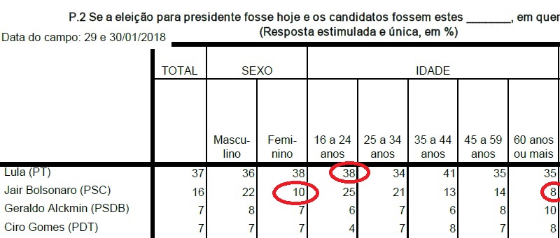 8) Lula tinha os seguintes números, por região, no final de novembro de 2017:  Sudeste 27, Sul 27, Nordeste 58, Centro Oeste 34 e Norte 43. Na última pesquisa, de final de janeiro, os números de Lula passaram para: Sudeste 28, Sul 23, Nordeste 58, Centro Oeste 27 e Norte 46. Ou seja, Lula ganhou 1 ponto no Sudeste e 3 pontos no Norte, mas perdeu 4 pontos no sul e 7 pontos no Centro Oeste, terra dos agronegócio.