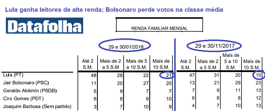 5) Bolsonaro perdeu eleitores de alta renda, ao passo que Lula avançou fortemente nessa faixa. Na pesquisa anterior, do final de novembro, por exemplo, Lula tinha apenas 15% dos votos entre eleitores que ganham mais de 10 salários. Perdia para Bolsonaro, que tinha 23 pontos. Agora, depois da condenação em segunda instância, Lula avançou 6 pontos nessa faixa e lidera com 21; Bolsonaro perdeu 3 pontos e agora tem 20, ficando em segundo lugar.