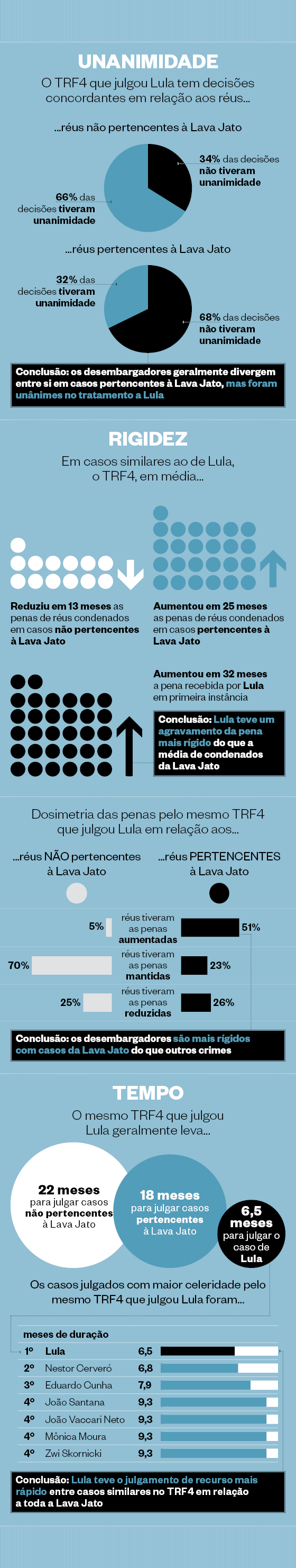 O julgamento de Lula foi o mais rápido entre os de todos os réus da Lava Jato analisados pelo TRF4. A decisão saiu seis meses e meio após a sentença em primeira instância, dada por Sergio Moro. Em média, casos da Lava Jato, que são avaliados mais rapidamente do que os demais, levam 18 meses para ser julgados.