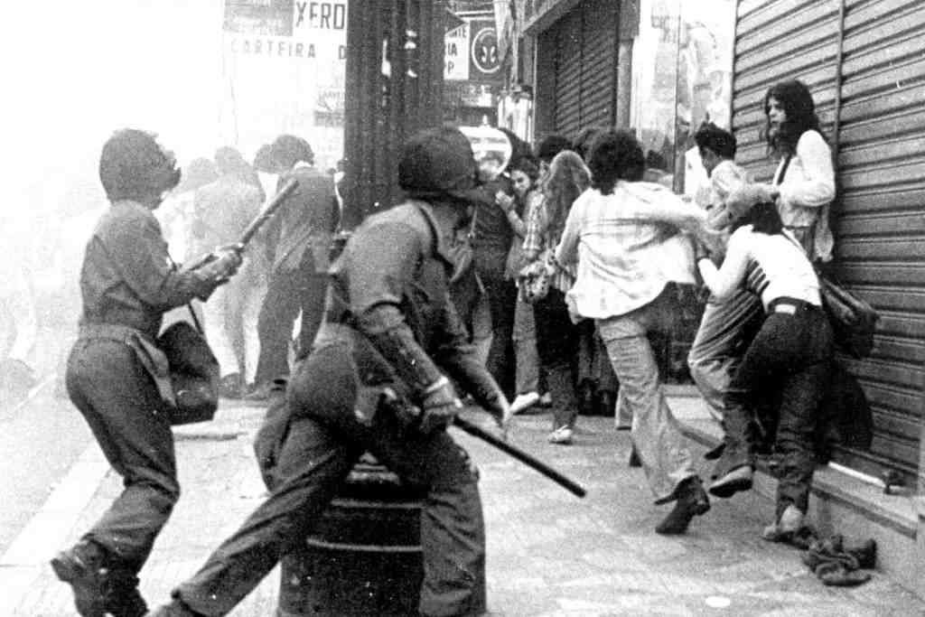 (Policiais reprimem manifestação de estudantes contra a Ditadura Militar, no centro de São Paulo, no dia 24/08/1977 ADRIANA NERY/Estadão Conteúdo ARQUIVO).