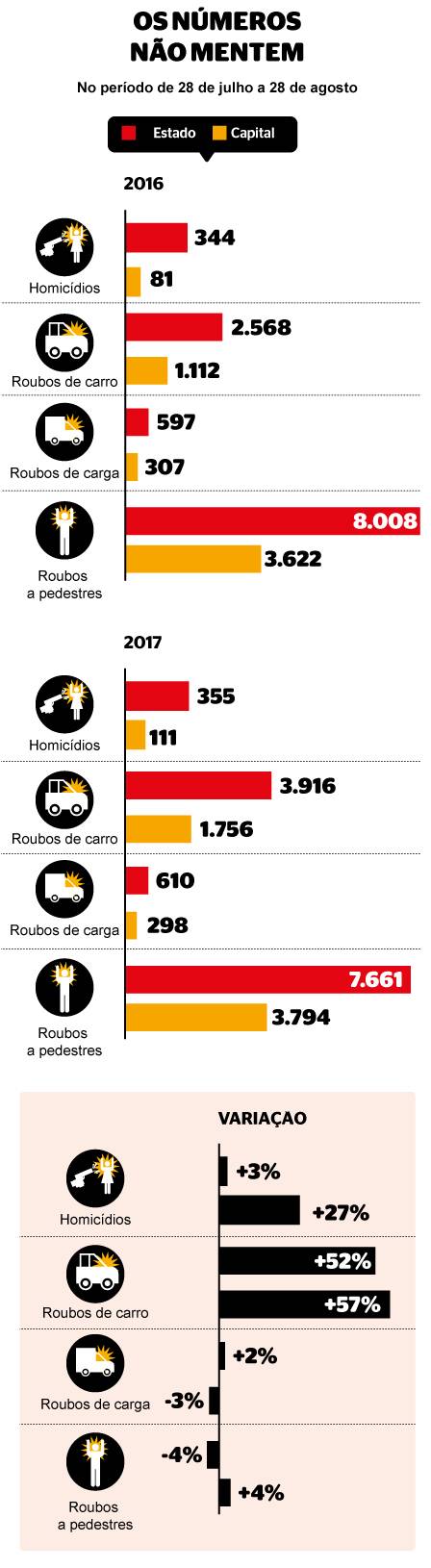 Mesmo com a presença de quase 9 mil soldados no Rio, de 28 de julho de 2017 ao final de agosto, quase todas as taxas de crime aumentaram, e muito. O número de homicídios na capital, por exemplo, cresceu 27% em agosto de 2017, mesmo com a presença do exército.