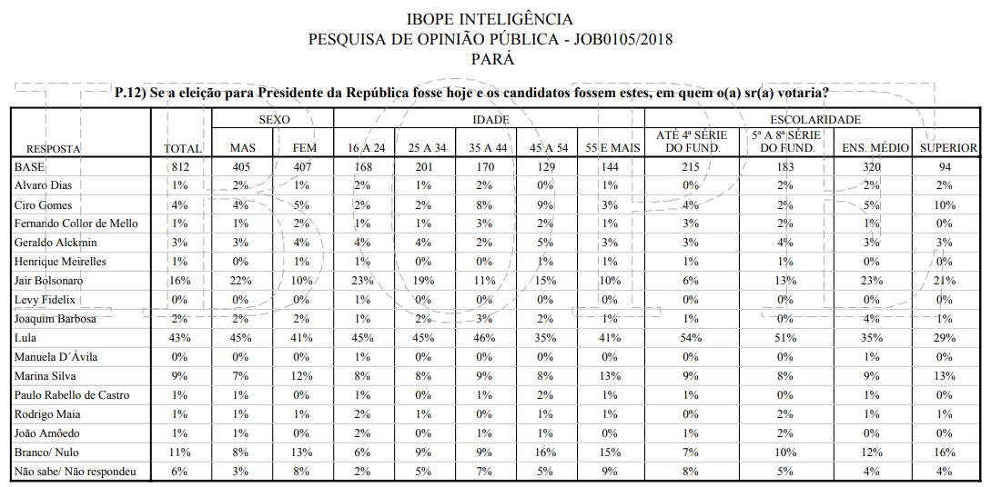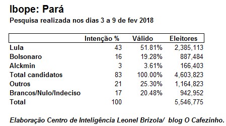 O Ibope publicou hoje, em seu site, a íntegra de uma pesquisa que realizou antes do Carnaval no estado do Pará, que tem 5,5 milhões de eleitores, segundo a última atualização do TSE.