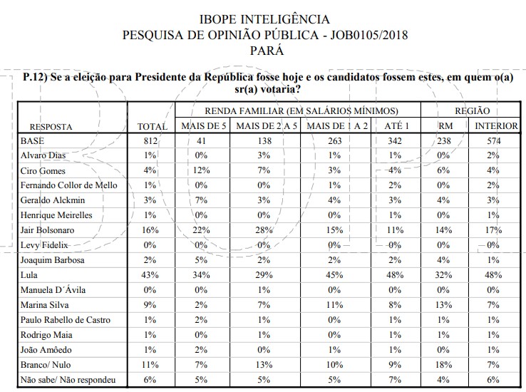 O leitor de Bolsonaro está muito concentrado em eleitores com faixa de renda entre 2 e 5 salários: aí ele tem 28%, enconstado em Lula, que tem 29%. Entre eleitores que ganham mais de 5 salários, porém, Bolsonaro cai para 22% e Lula avança para 34%. A força maior de Lula, de qualquer forma, está no eleitor mais pobre, que ganha até 1 salário, onde ele tem 48% dos votos, contra apenas 11% de Bolsonaro. Lula tem mais força no interior do Pará, onde tem 48%, contra 32% na região metropolitana.