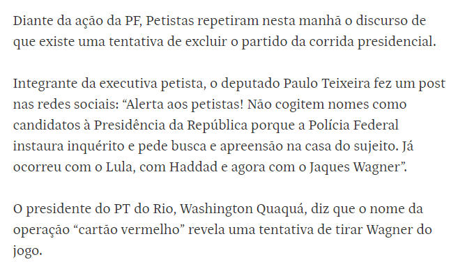 É evidente, além disso, que a operação na Bahia tem como objetivo dificultar igualmente os esforços do PT baiano de se manter no poder, abrindo espaço para as tradicionais forças da direita local, ancoradas, não por acaso, no domínio do carlismo sobre os meios de comunicação, a começar pela afiliada da Globo.