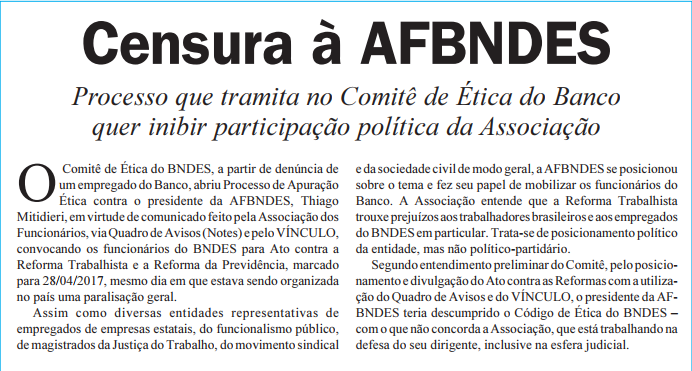 O jornal da Associação de Funcionários do BNDES noticia que o banco abriu um processo de ética contra o presidente da entidade, Thiago Mitidieri, por motivos puramente políticos.