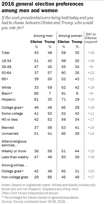 Se Trump ganhava entre homens, de 49% a 43%, entre mulheres, o republicano perdia feio, de 59% a 35%. Quando você associa gênero e idade, ou gênero e raça, a disparidade é ainda maior: entre jovens mulheres (18 a 34 anos), Clinton ganhavam de 69% a 25%; entre mulheres negras, a candidata democrata de 91% a 6%.