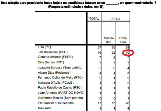 Aqui no Brasil, não é tão diferente. Segundo a última pesquisa Datafolha, feita entre os dias 29 e 30 de janeiro de 2018 (tentando capturar, como eles sempre fazem, os efeitos da condenação judicial de Lula em 2ª instância), o candidato orgânico da direita, Jair Bolsonaro, é absolutamente marginal entre as mulheres, com apenas 10%, empatado tecnicamente com Alckmin e e Ciro Gomes.