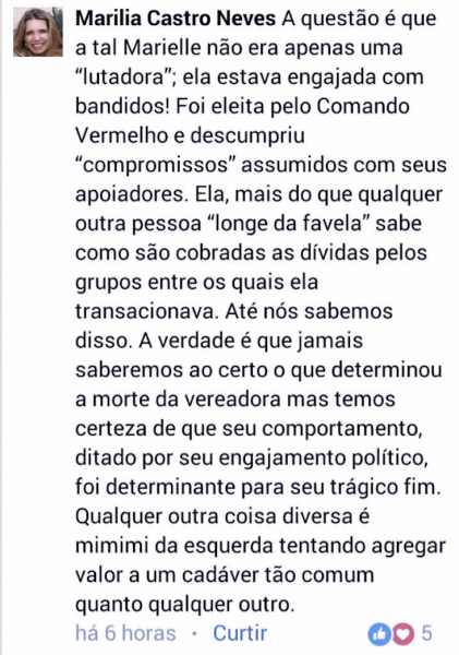 A desembargadora publicou a mentira em seu perfil no Facebook: “A questão é que a tal Marielle não era apenas uma ‘lutadora’, ela estava engajada com bandidos! Foi eleita pelo Comando Vermelho e descumpriu ‘compromissos’ assumidos com seus apoiadores. Ela, mais do que qualquer outra pessoa ‘longe da favela’ sabe como são cobradas as dívidas pelos grupos entre os quais ela transacionava”.