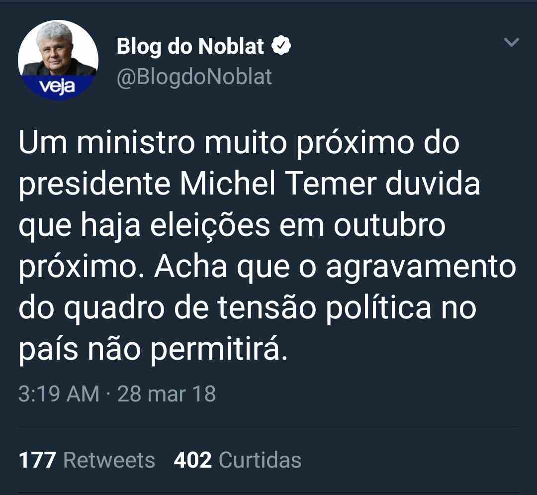 Eu confesso que sempre acreditei que não teríamos eleições em 18, mas agora o noblat falou isso, começo a acreditar que teremos…