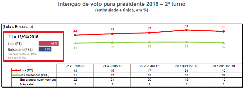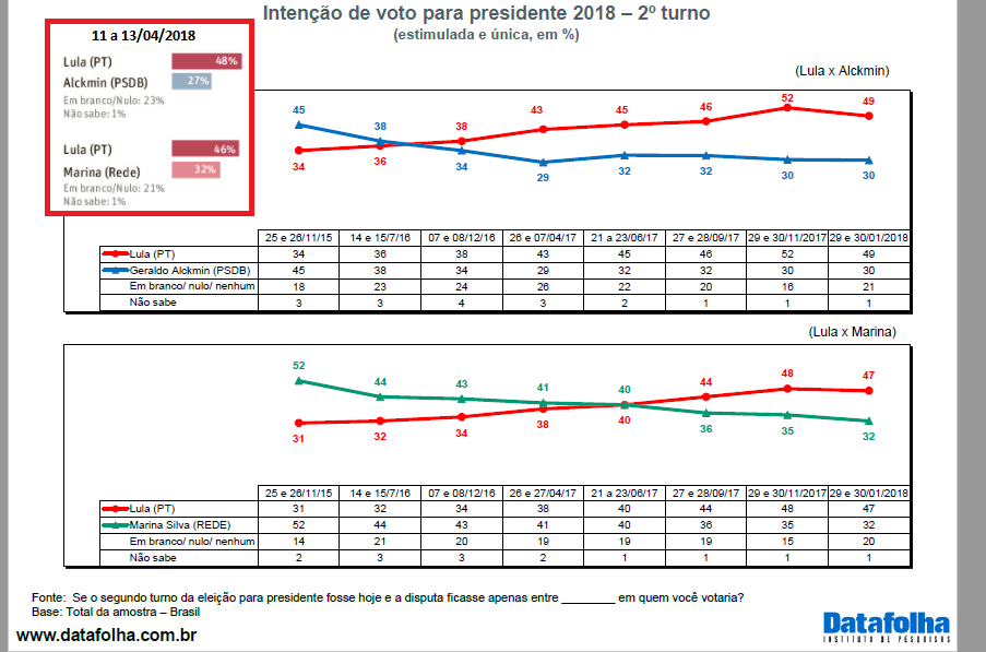Então eu fui atrás dos gráficos do Datafolha, atuais e antigos, para checar a informação. Confirmei. Confira abaixo. Ou seja, a manchete da Folha, de que Lula “perde força” após sua prisão está, no mínimo, exagerada.