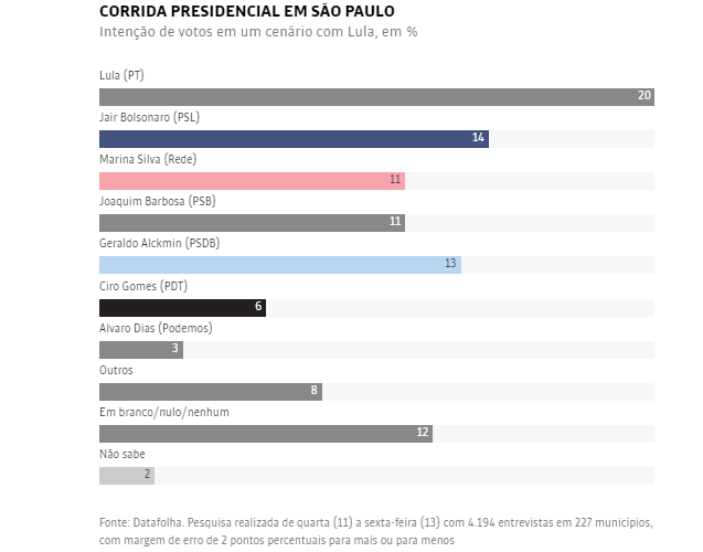 Segundo o Datafolha, Lula tem 20% das intenções de voto em São Paulo, 6 ou 7 pontos a frente dos segundos colocados, Bolsonaro e Alckmin.